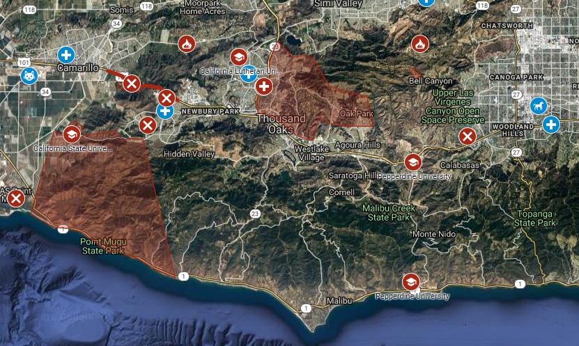 The general area of the Woolsey Fire is depicted on the far right and the Hill Fire on the left of the image below.